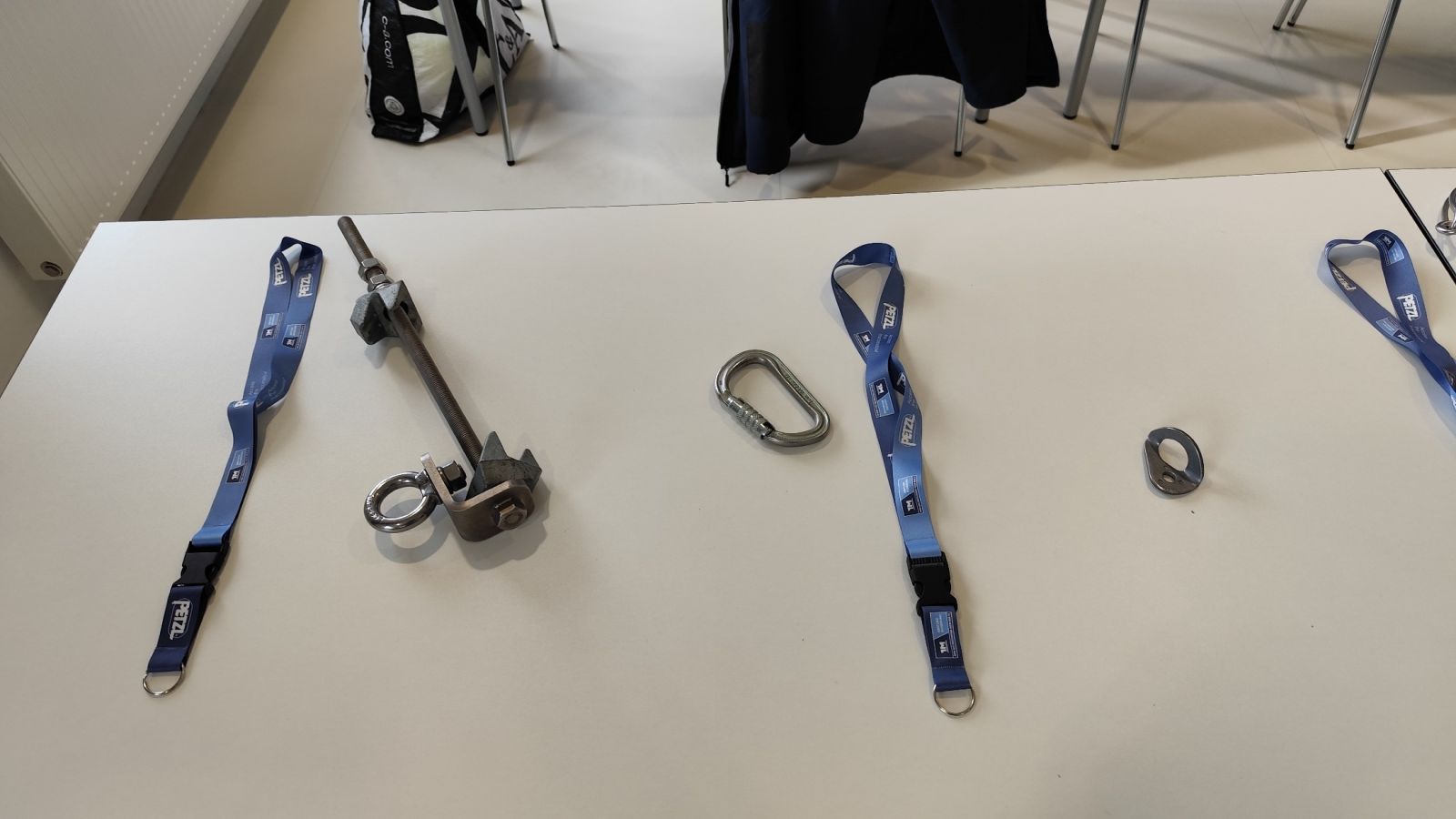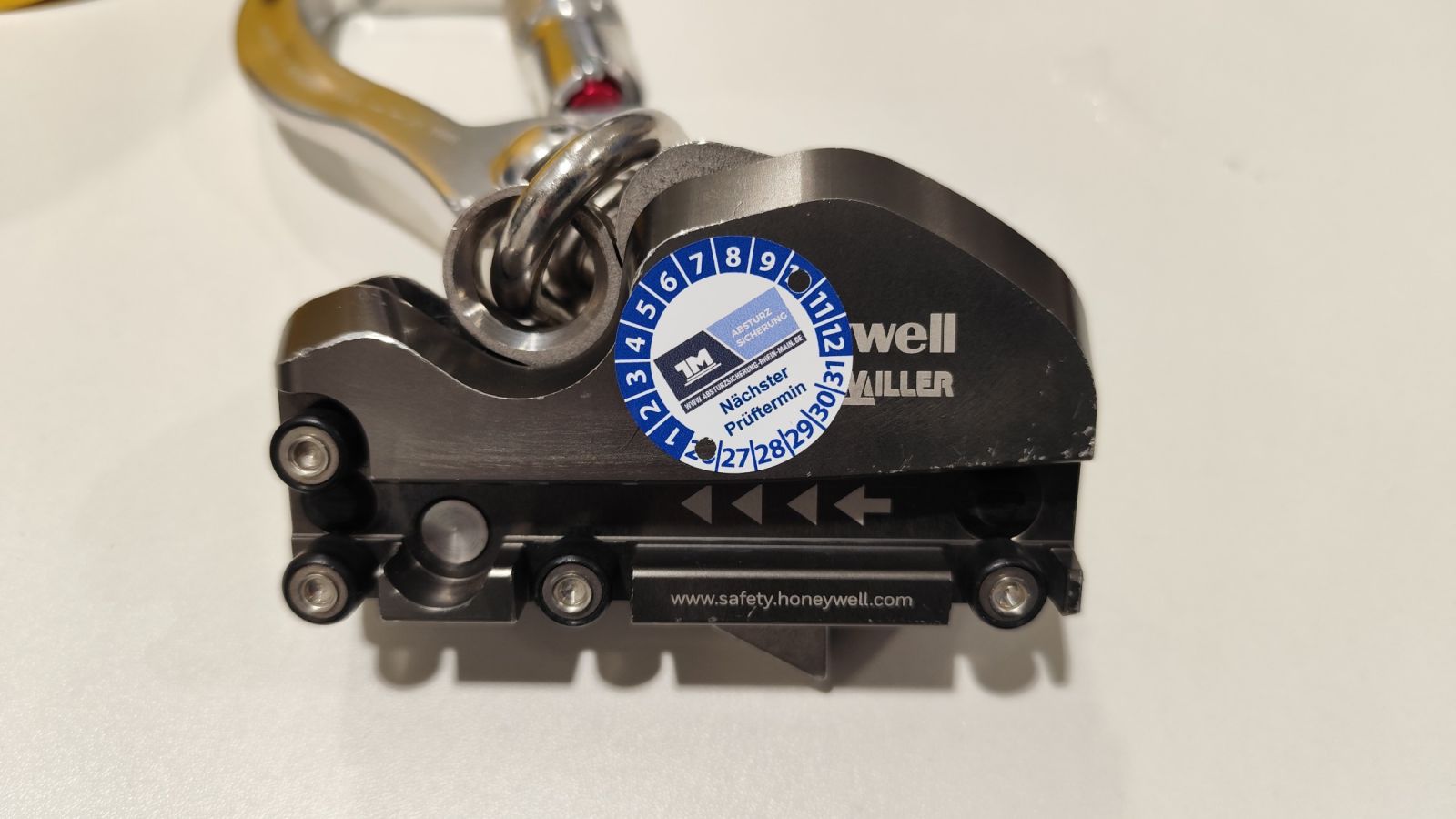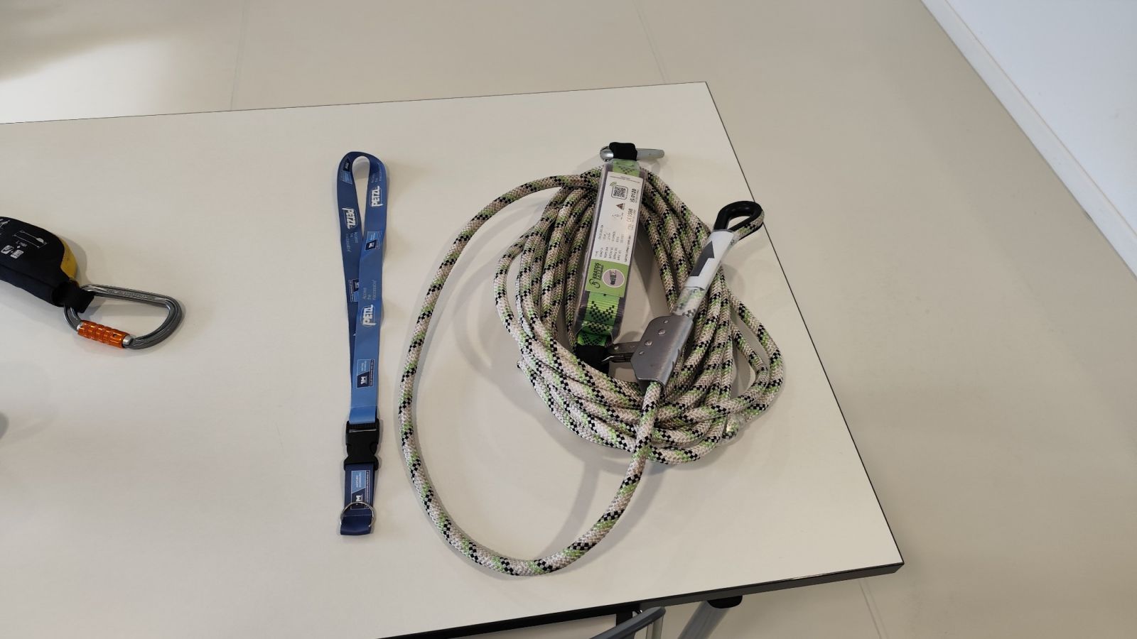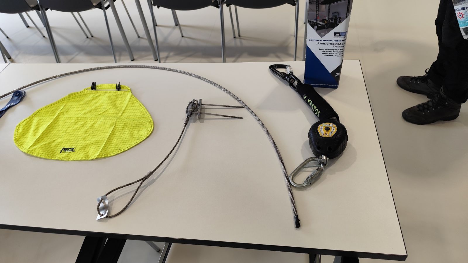 Im Anschluss an die Schulung wurden sämtliche Steig- und Sicherungsgeräte (Gurte, Anschlagmittel, Läufer u. a.) durch den Fachmann vor Ort überprüft, dokumentiert und zertifiziert.