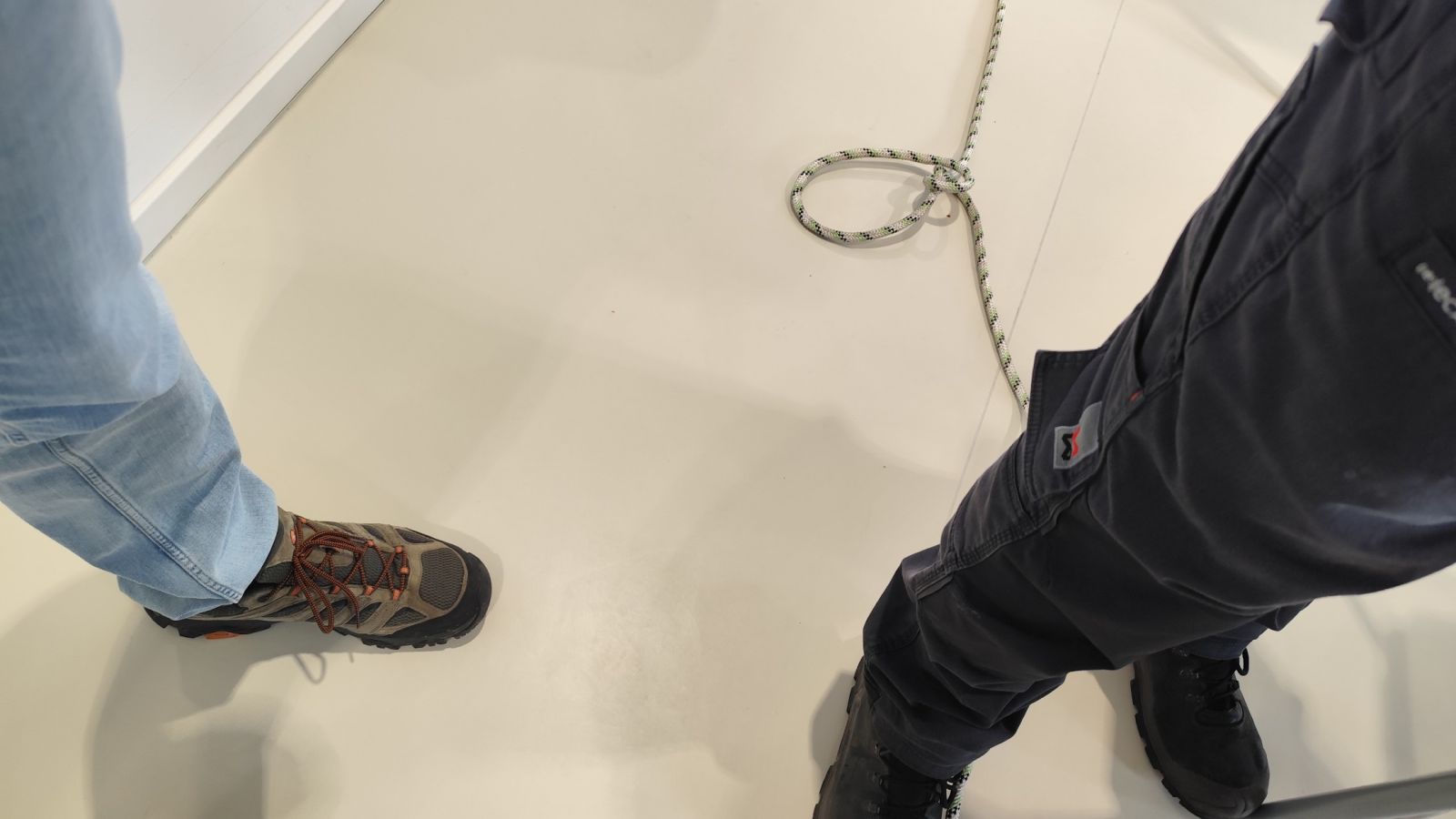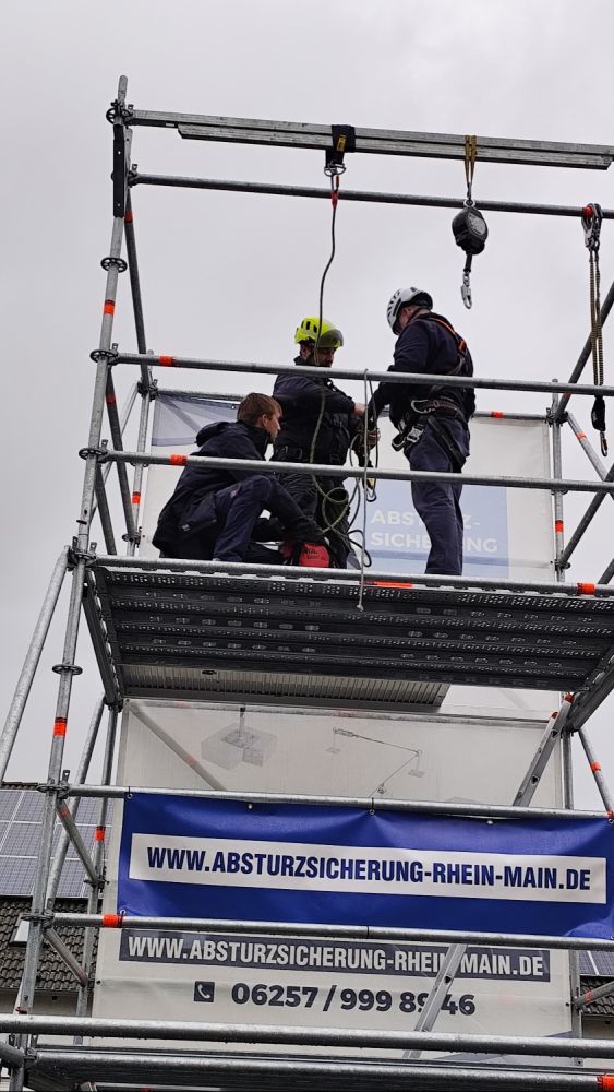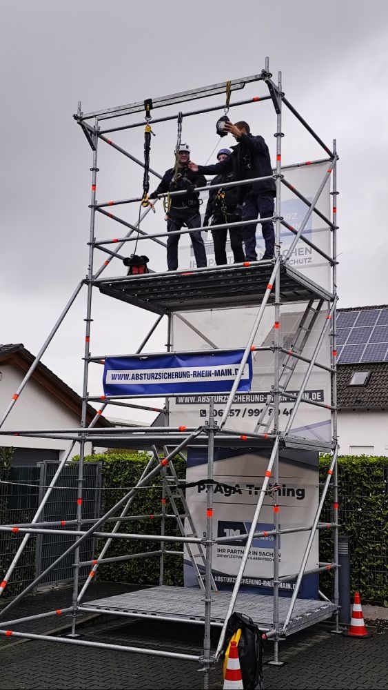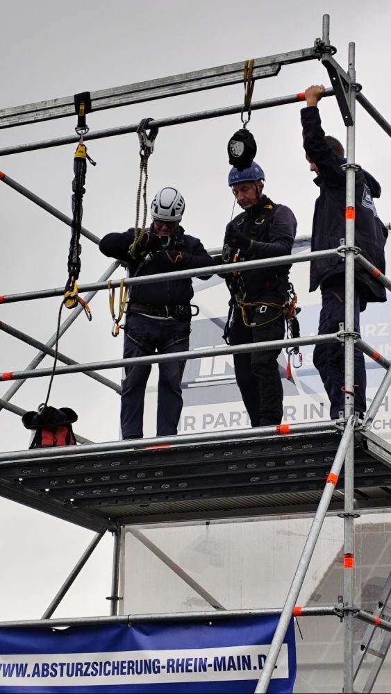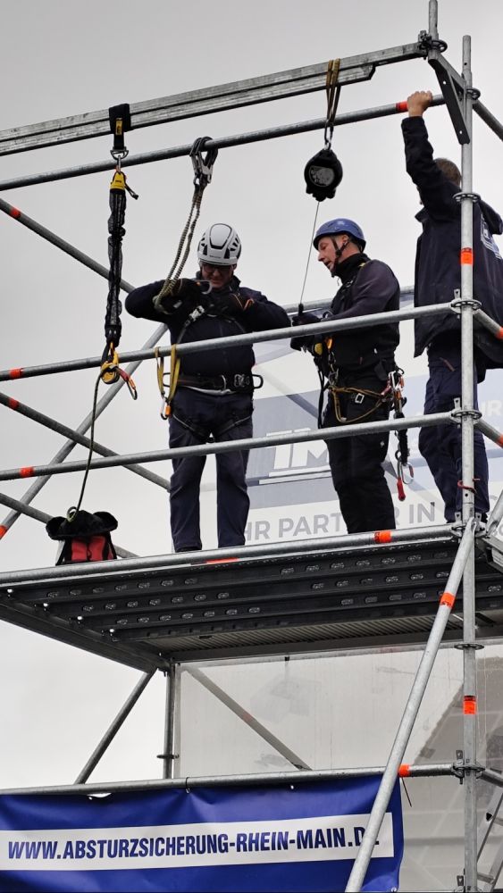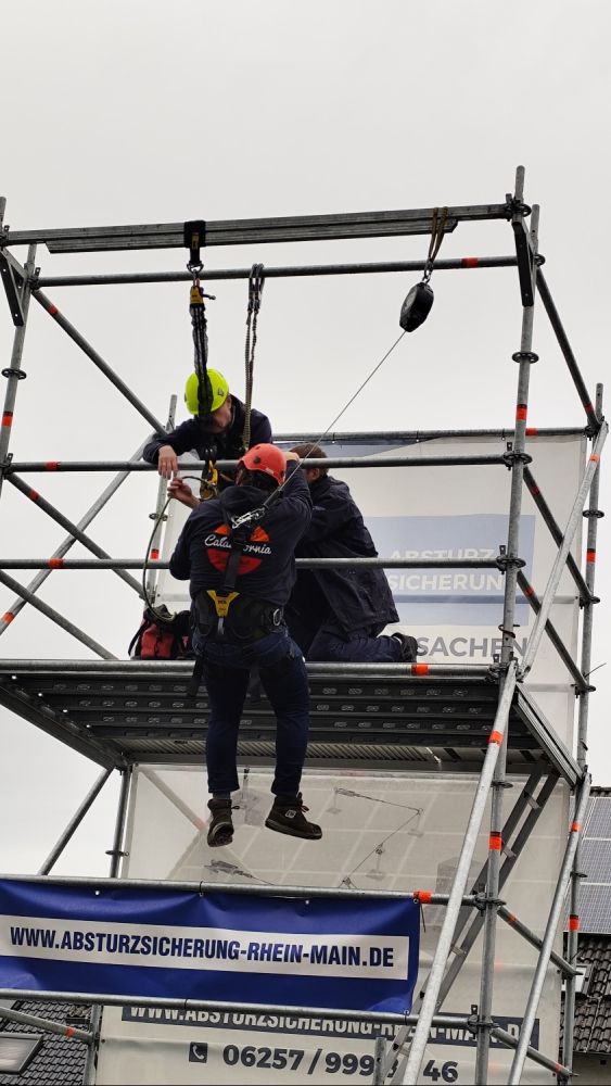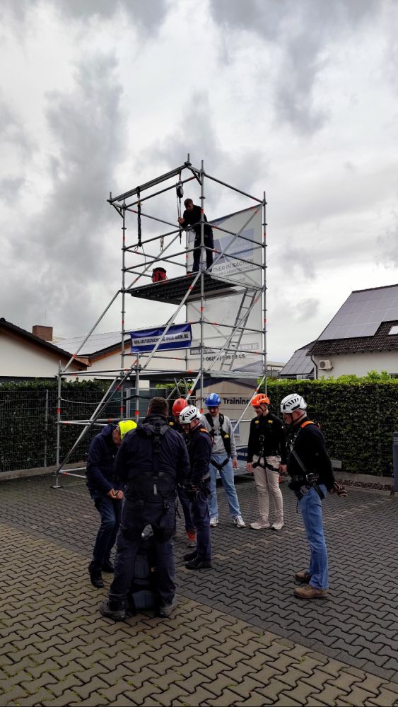 Im anschließenden Praxisteil wurde an einem 6 m hohen Außengerüst die Rettung einer Person aus der Höhe simuliert – sowohl durch einen Retter als auch in Form einer Selbstrettung. Dabei konnten alle Teilnehmer die zuvor besprochenen Konzepte unmittelbar anwenden und wertvolle Routine für den Ernstfall gewinnen.