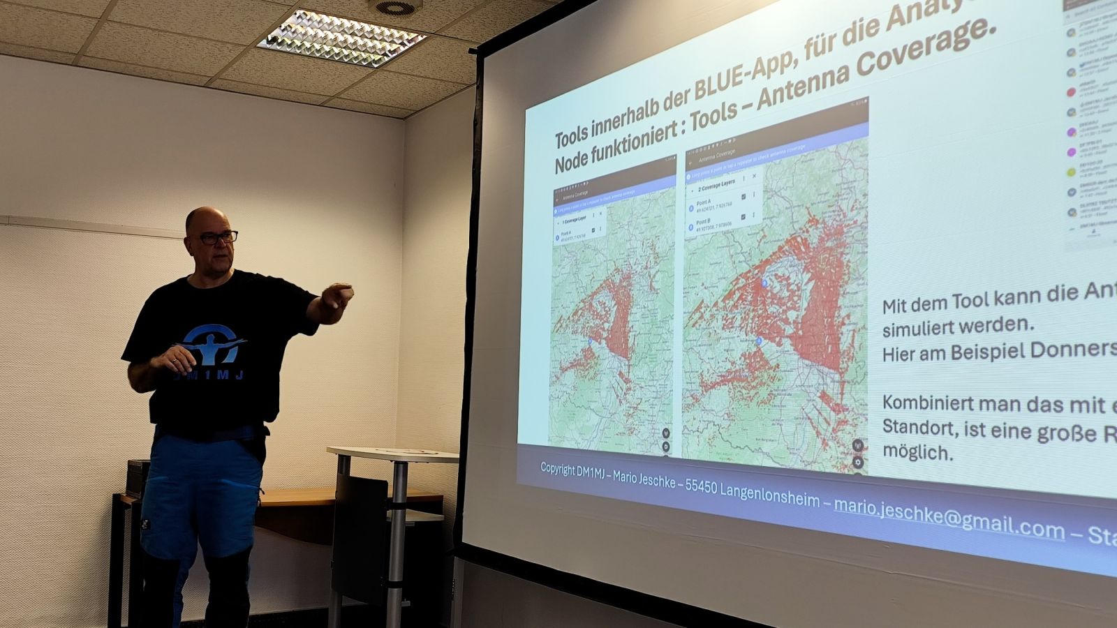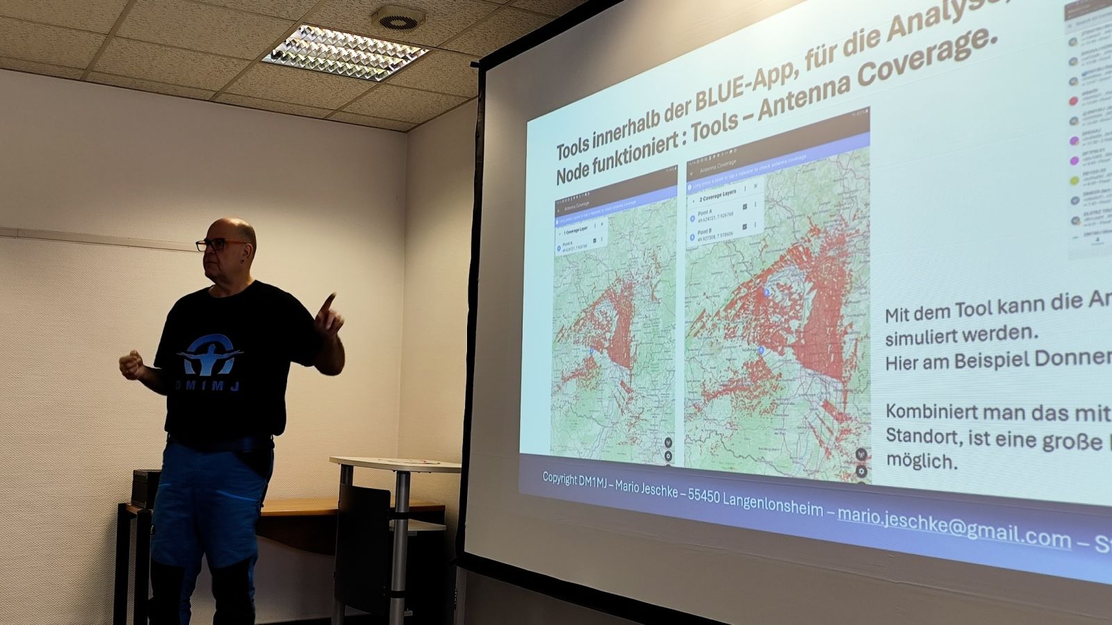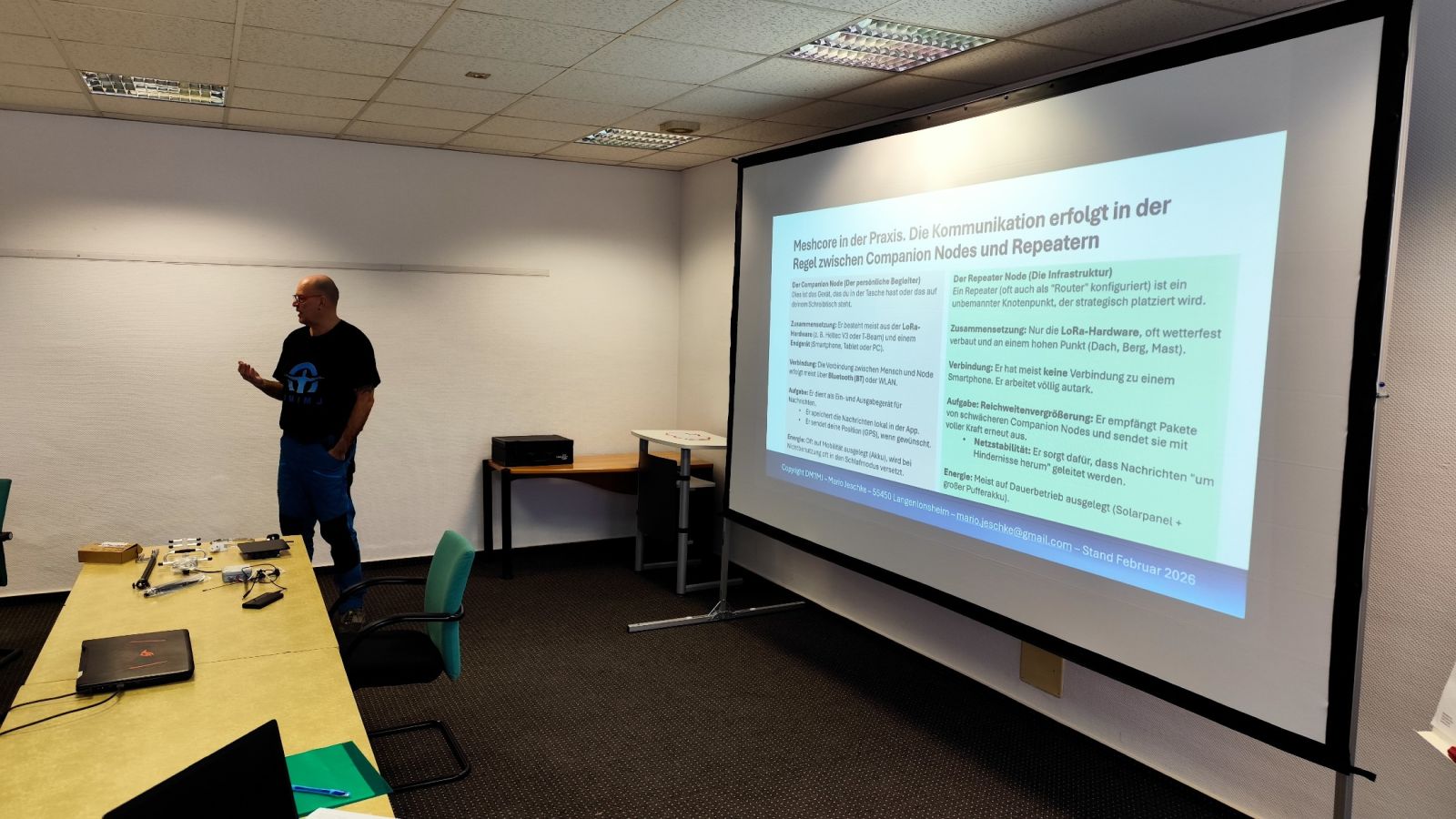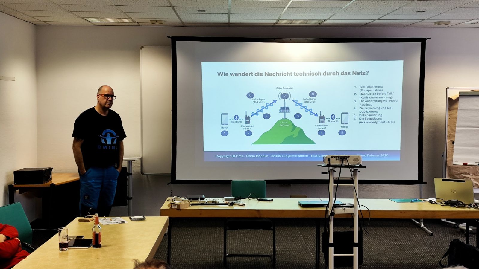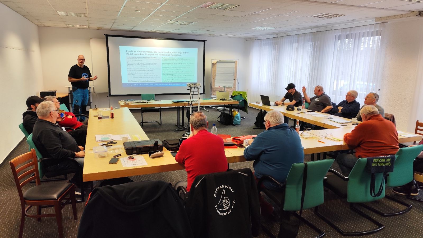 Bereits um 09:00 Uhr startete das traditionelle Mesh-Treffen der Mitglieder und Gäste. Den fachlichen Schwerpunkt setzte der Vortrag von Mario Jeschke, DM1MJ, der Meshcore in der Praxis vorstellte – mit Fokus auf Inbetriebnahme, typische Fehlerquellen, Optimierung und dem zentralen Nutzen als Notfall-Kommunikationssystem.
